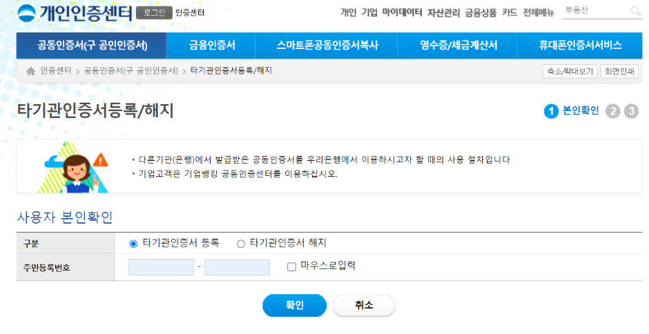 타기관 인증서 등록이 완료되면 B(우리)은행 사이트에서