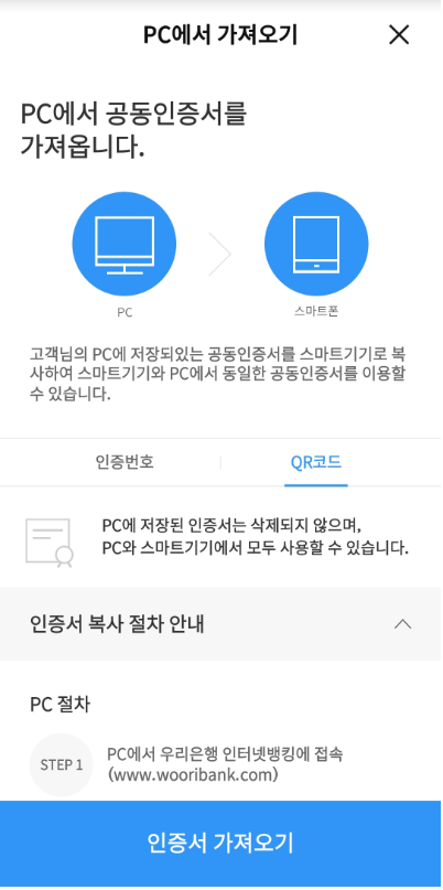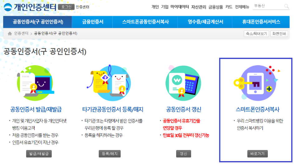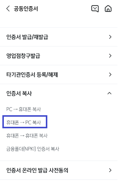 스마트폰인증서 복사 통해 휴대폰으로 인증서를 복사합니다.