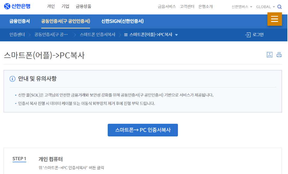 핸드폰에서 A(신한)은행 인증서를 휴대폰->PC 복사를 선택하여