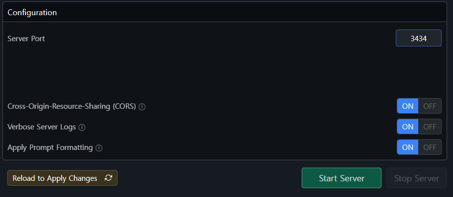 아래 Reload to Apply Changes 버튼을 클릭하여 변경사항을 저장하고 Start Server 를 클릭합니다.