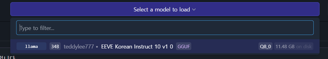 여기에서 상단에 Select a model to load 을 클릭해 다운로드한 모델을 선택합니다.