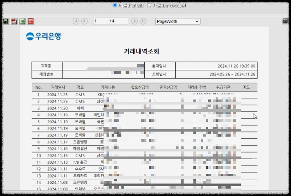거러 내역에는 고객명이 있습니다. pdf 로 저장합니다. 상단 좌측에 pdf 아이콘을 클릭하면 됩니다.