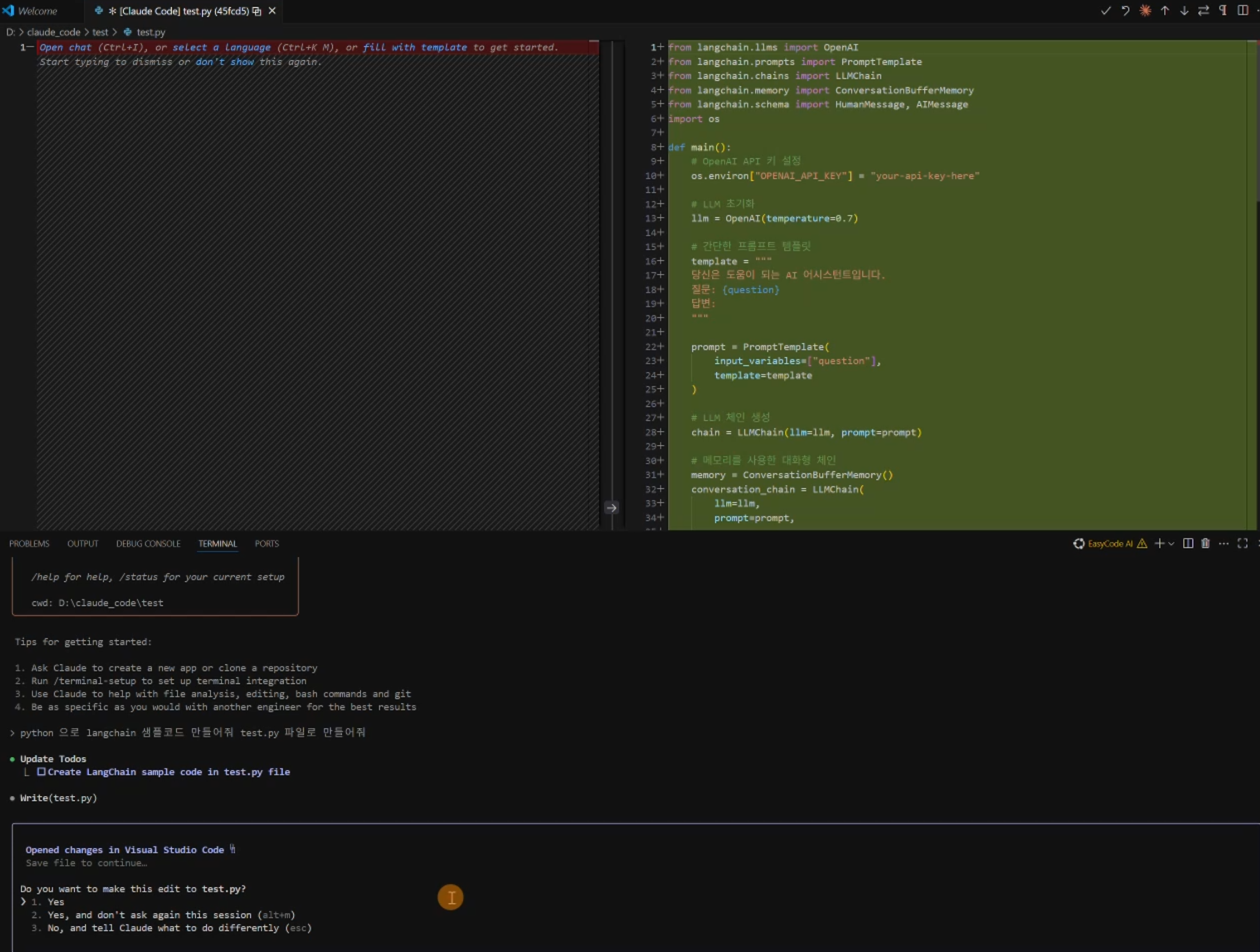 간단하게 python 으로 langchein 예제를 만들어 달라고 했습니다.