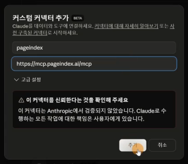 이름은 pageindex 로 하고 주소는 https://mcp.pageindex.ai/mcp 를 넣고 추가 버튼을 클릭합니다.