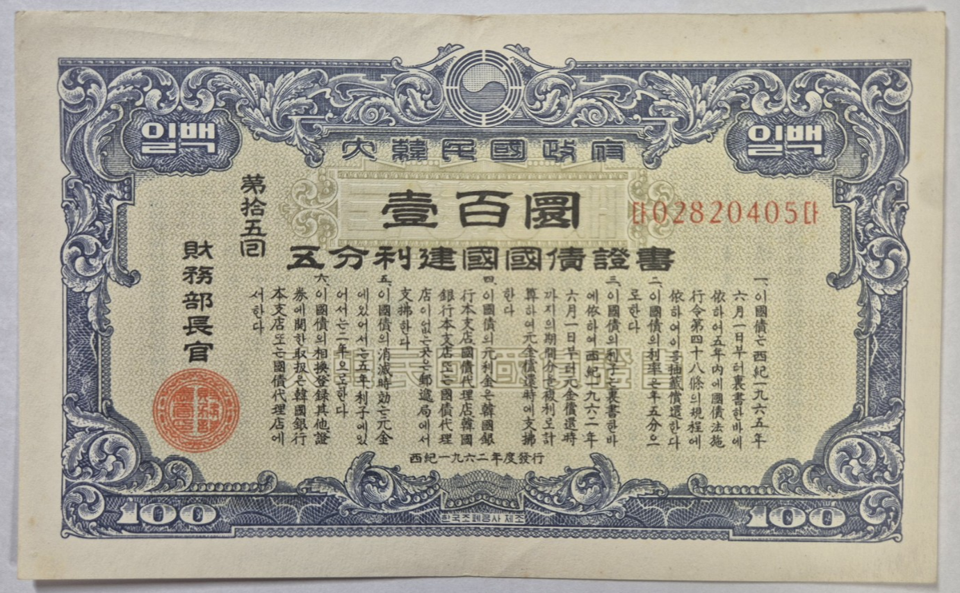 명칭: 대한민국 100환 건국국채 증서 (100 Hwan National Reconstruction Bond Certificate) 발행 주체: Bank of Korea (한국은행) / 대한민국 정부 통화 단위: 100 Hwan (환) — 당시 단위로, 1953년 ~ 1962년 사용되던 화폐 단위 년대 / 연도: 1962년 발행된 건이 가장 마지막 유형 중 하나. 종류: 국채 증서 (채권) — 당시 정부가 국가 재건 및 재정 조달을 위해 발행한 “오분리 건국국채 (5% 이율)” 증서