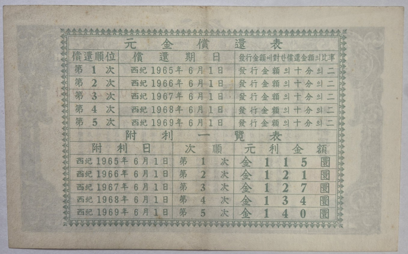 뒷면에는 “元金償還表 / 附利一覽表” 형태로, 원금 상환 일정과 이자 지급 내역이 표 형태로 인쇄되어 있음 — 즉, 이 채권이 만기 후 원리금 상환이 약속된 증서였음을 보여줌.