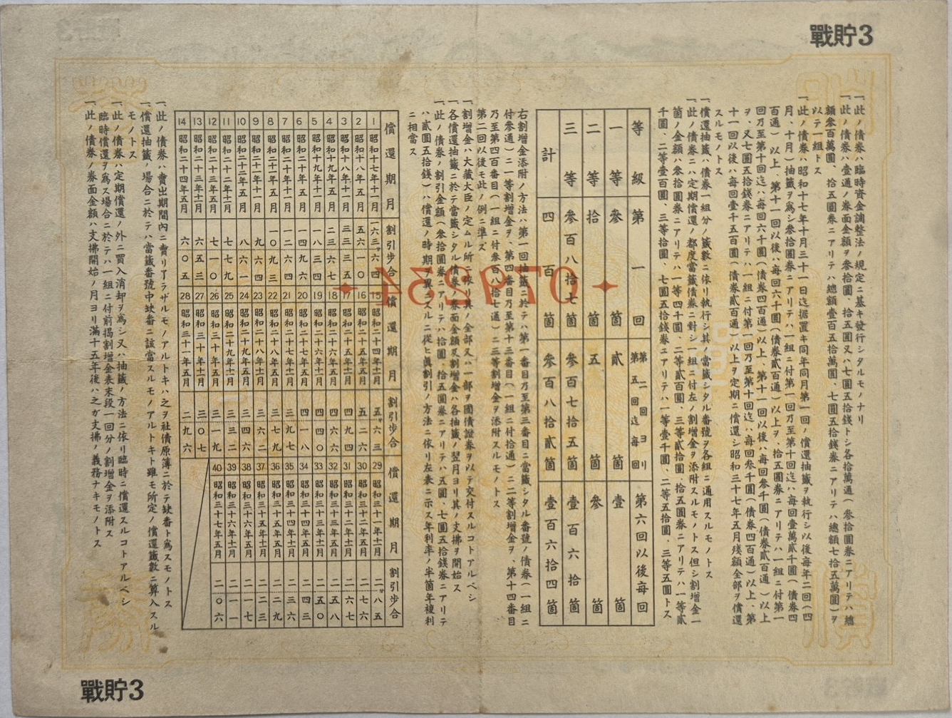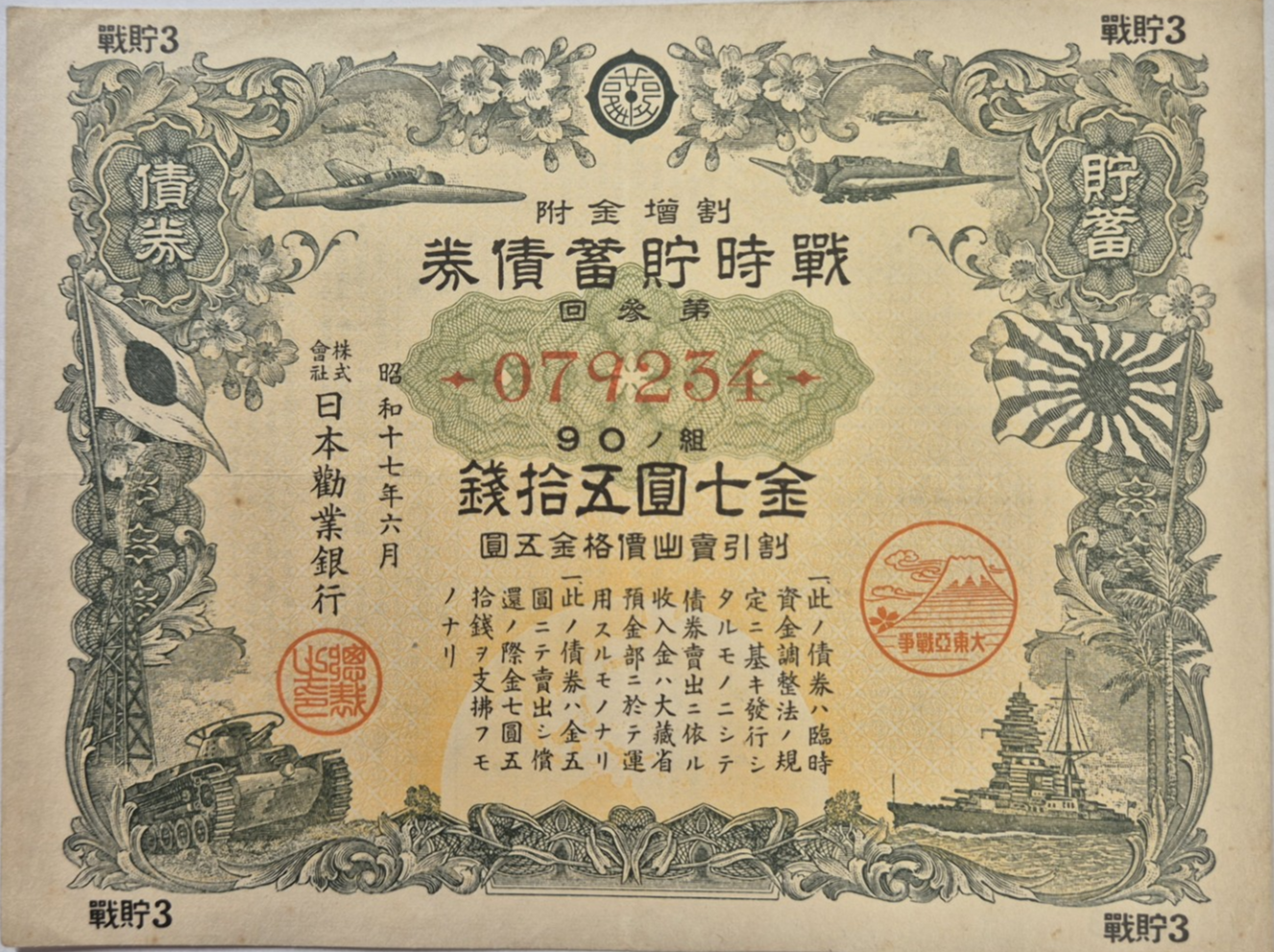 이 채권은 일본이 제2차 세계대전(大東亜戦争) 중 전쟁비용을 조달하기 위해 발행한 ‘전시 저축 채권’ 입니다.