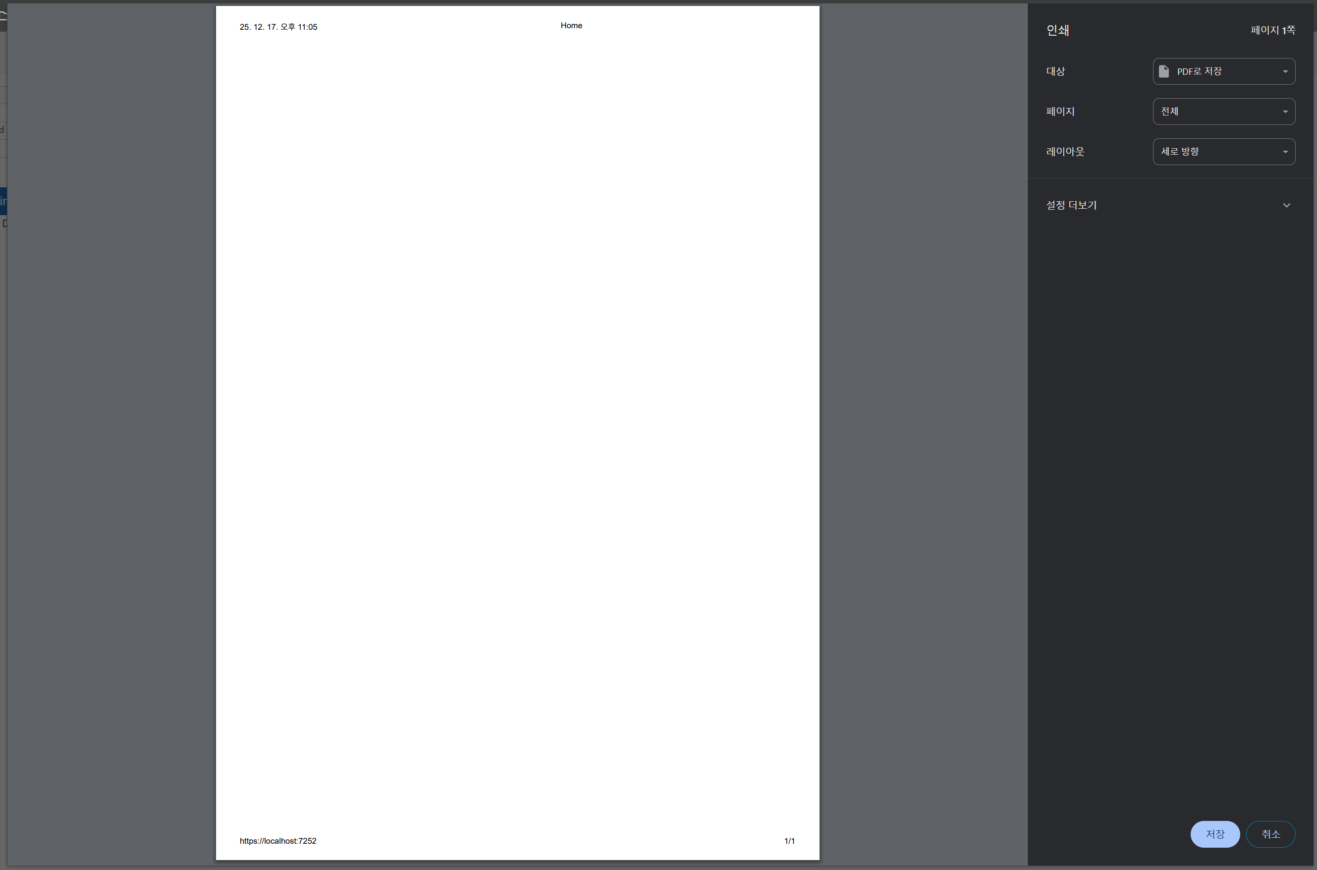실행하고 인쇄를 하면 아래처럼 빈화면만 표시됩니다.