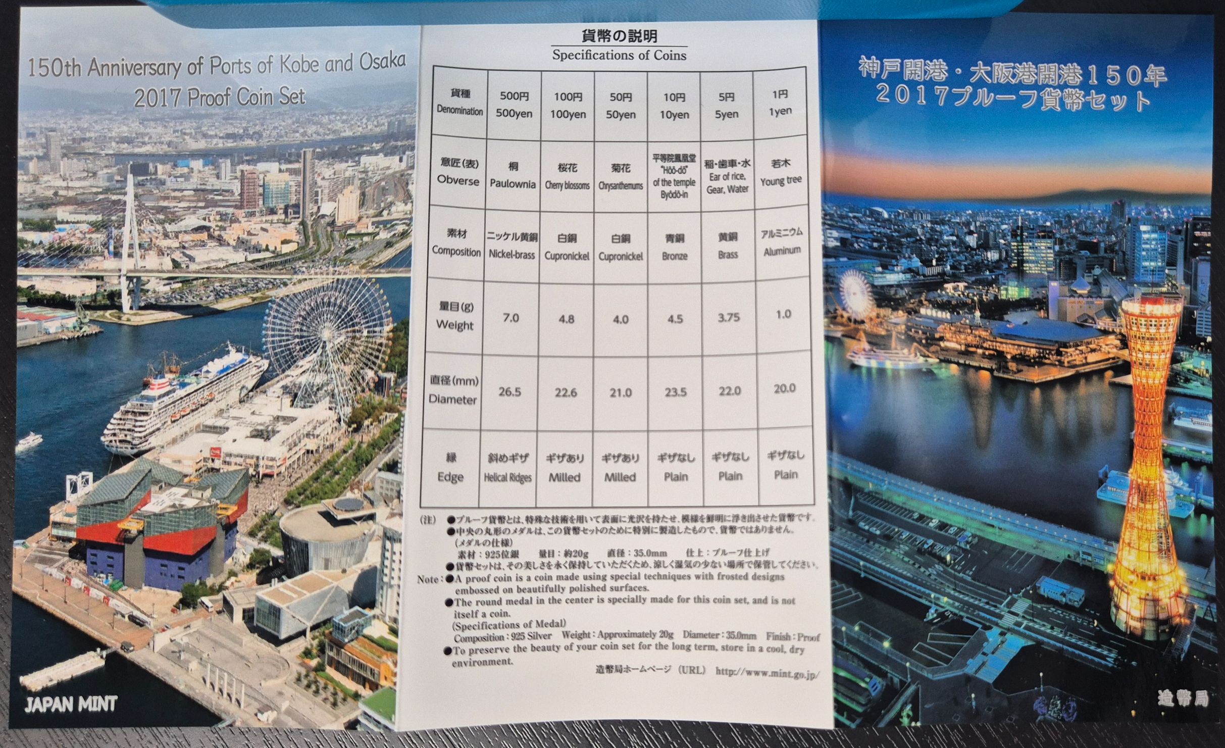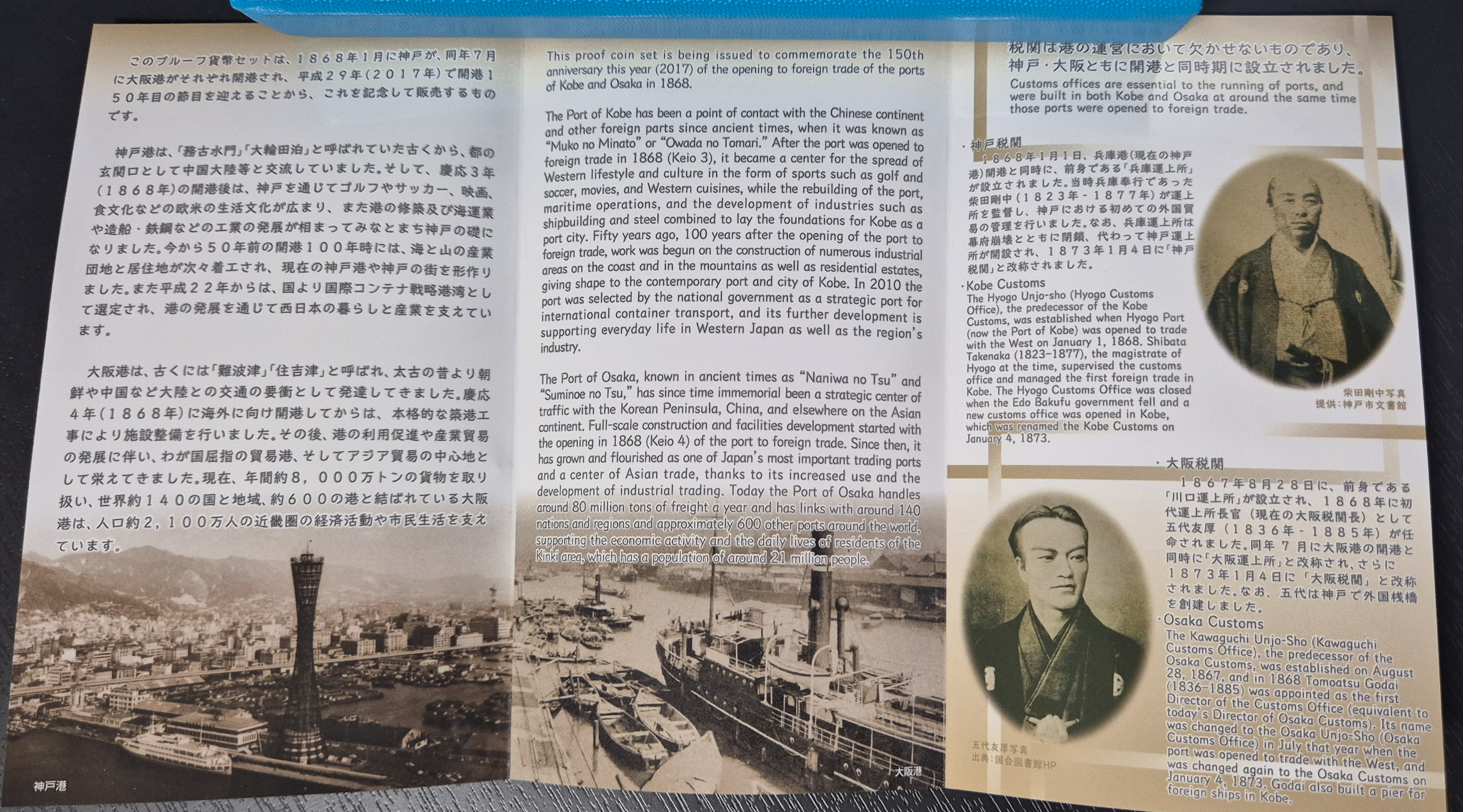 고베항과 오사카항은 일본이 근대 국가로 전환되며 서구 문물을 받아들이는 핵심 관문이었다. 무역, 문화, 산업, 스포츠, 음식 문화까지 일본 근대화의 시작점이라 해도 과언이 아니다. 이러한 역사성을 기념해 일본 조폐국은 프루프 화폐 세트 + 기념 메달이라는 형식으로 이 세트를 발행했다.