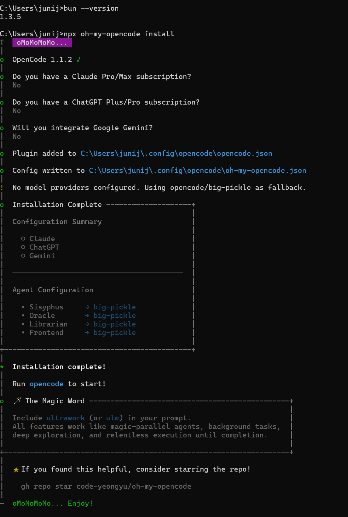 cmd 창에서 bun 버전 확인 및 oh my opencode 를 설치합니다.