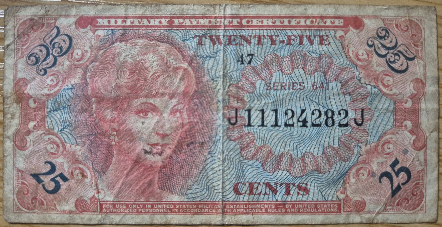 이 지폐는 미국 군대 지불 증서(Military Payment Certificate, MPC)로,Series 641의 25센트(25 Cents) 권종입니다.