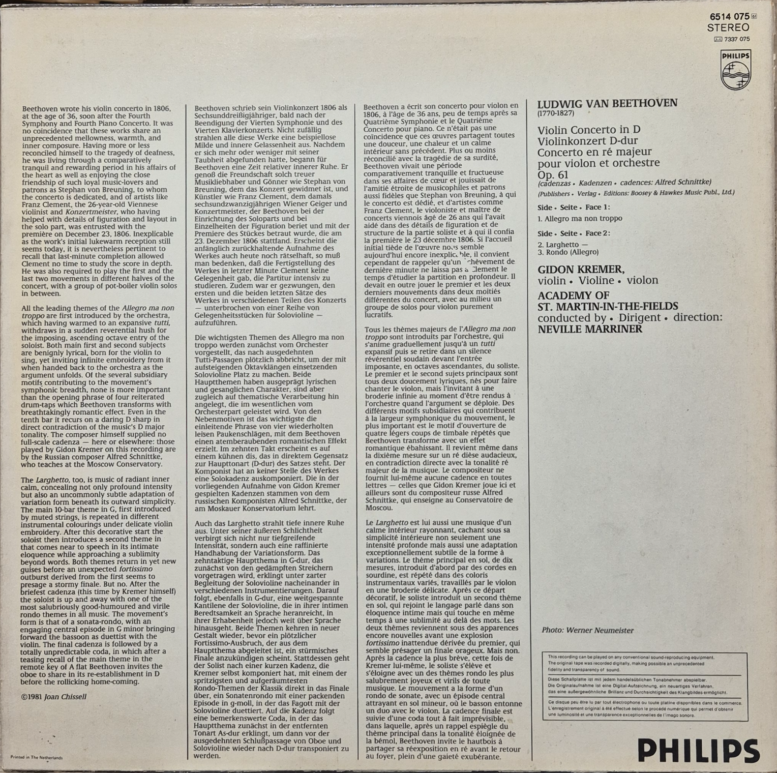 1980년대 초, 필립스가 클래식 디지털 녹음의 선두에 서 있던 시기에 제작된 음반으로, 당시 젊은 거장으로 주목받던 기돈 크레머와 완벽한 합주력의 네빌 마리너 조합만으로도 큰 화제를 모았습니다.