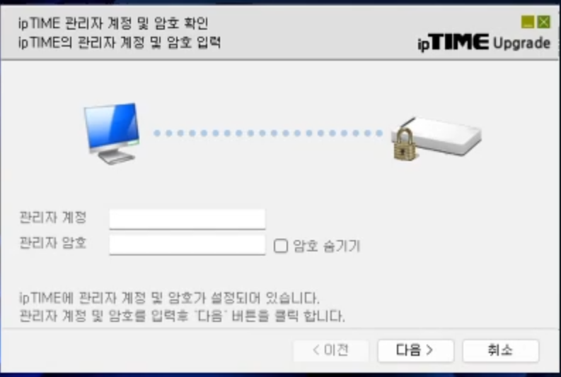 다운로드한 프로그램을 실행하면 바로 IPTIME 공유기를 찾고 로그인 창이 나오면 계정을 입력하고 다음을 클릭합니다.