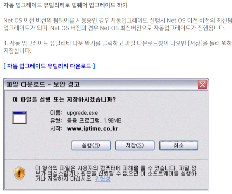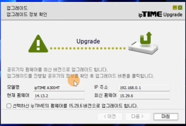 아래처럼 IPTIME 공유기가 자동으로 업데이트가 되지 않아서 프로그램을 이용해서 업데이트하는 방법을 알아봅니다.