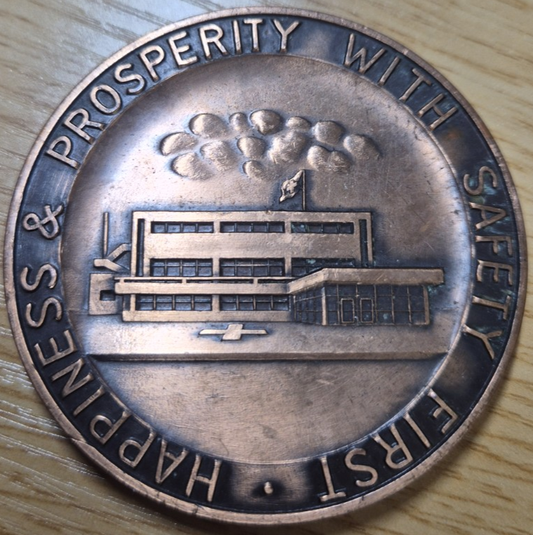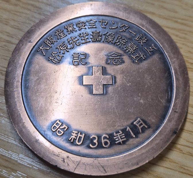 오사카 지역 산업 안전 센터 설립을 기념하며, ‘마츠바라’라는 인물의 공로를 기리기 위해 제작된 기념 메달