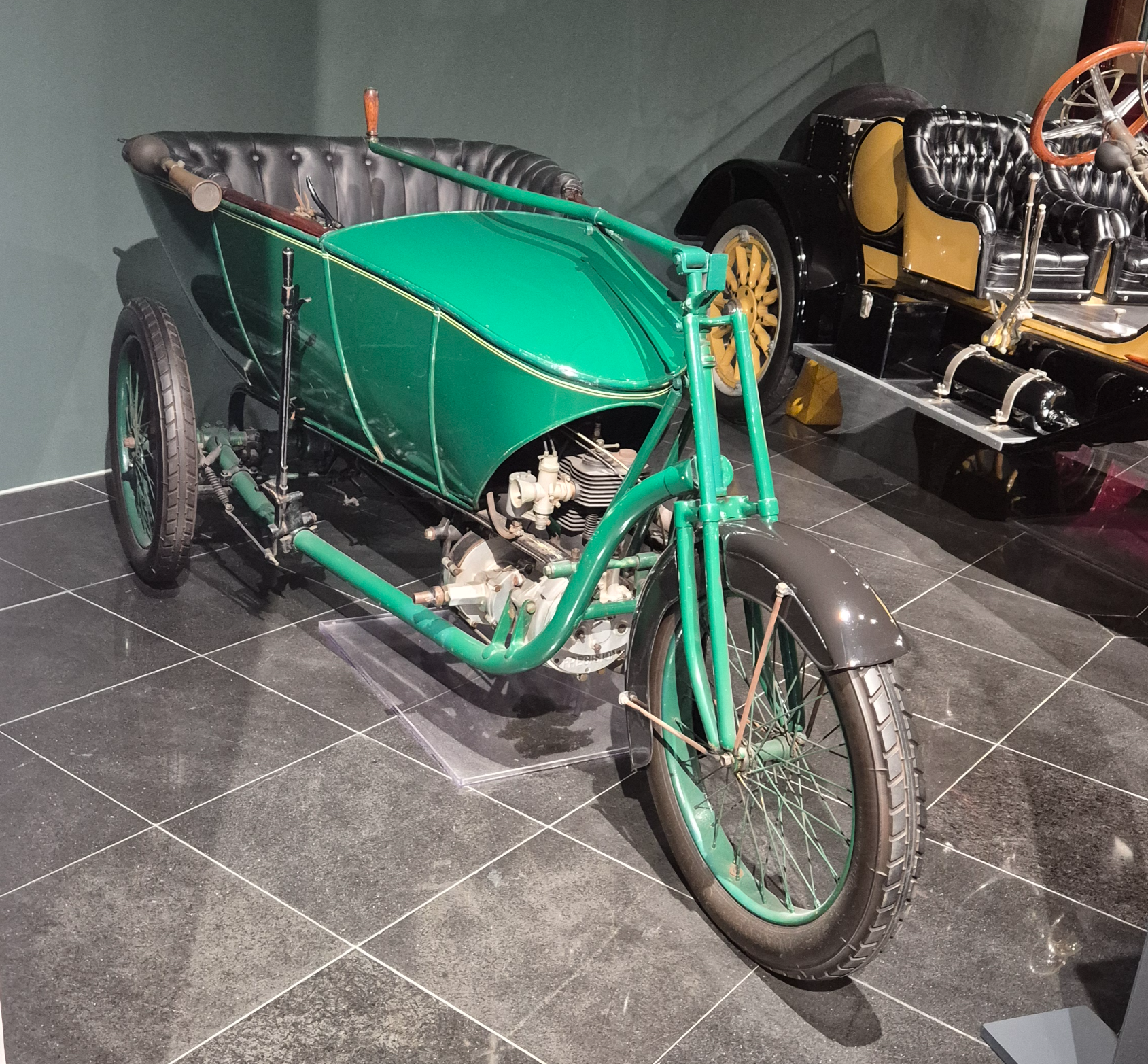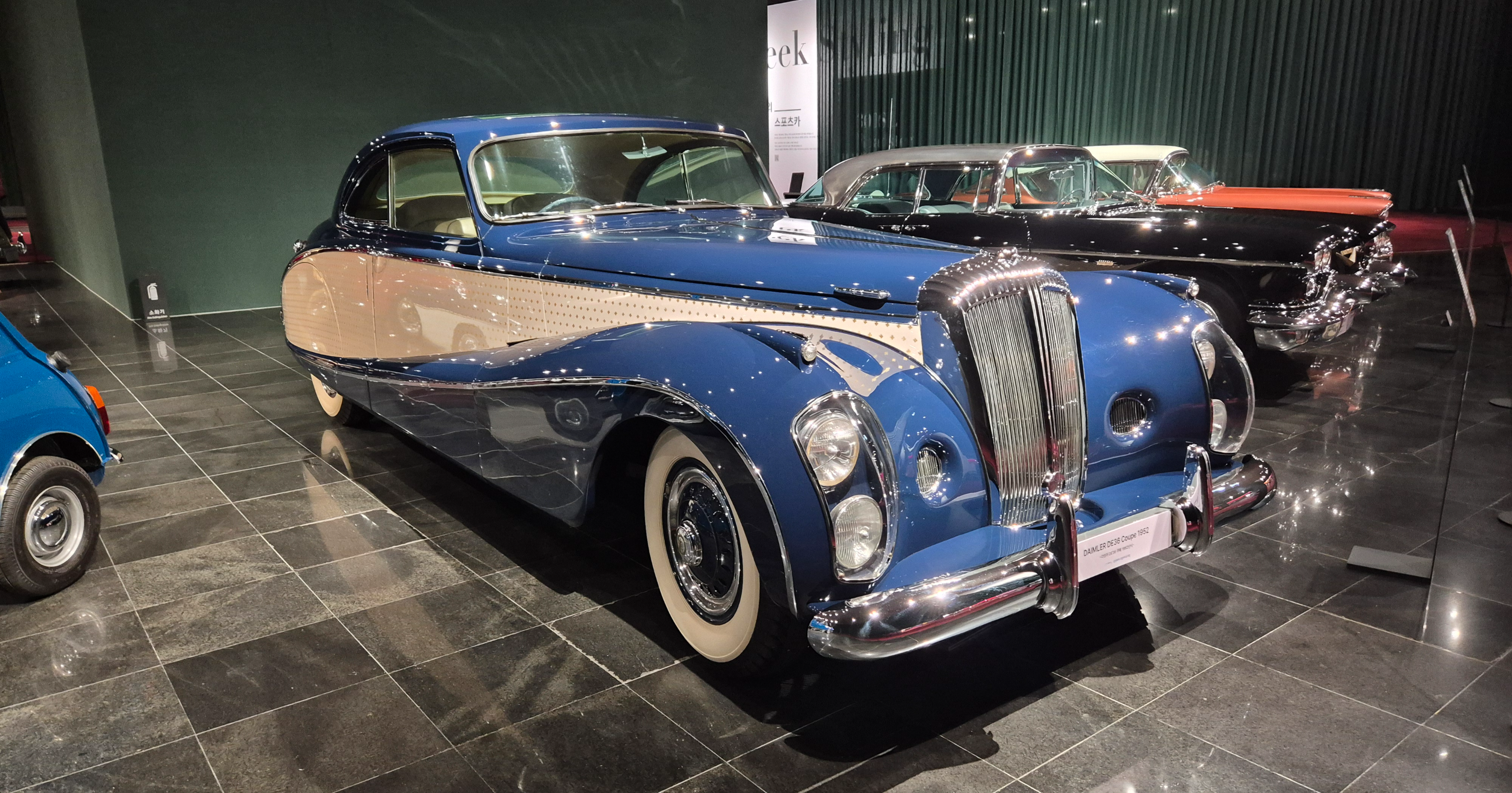 전면에 보이는 멋진 옛날 차량입니다. 민트색으로 디자인도 독특합니다.