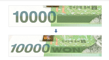 확인법: 기울이면 예를 들어 숫자가 다른 숫자로 바뀌거나, 무늬가 좌우로 이동하는 느낌이 남.