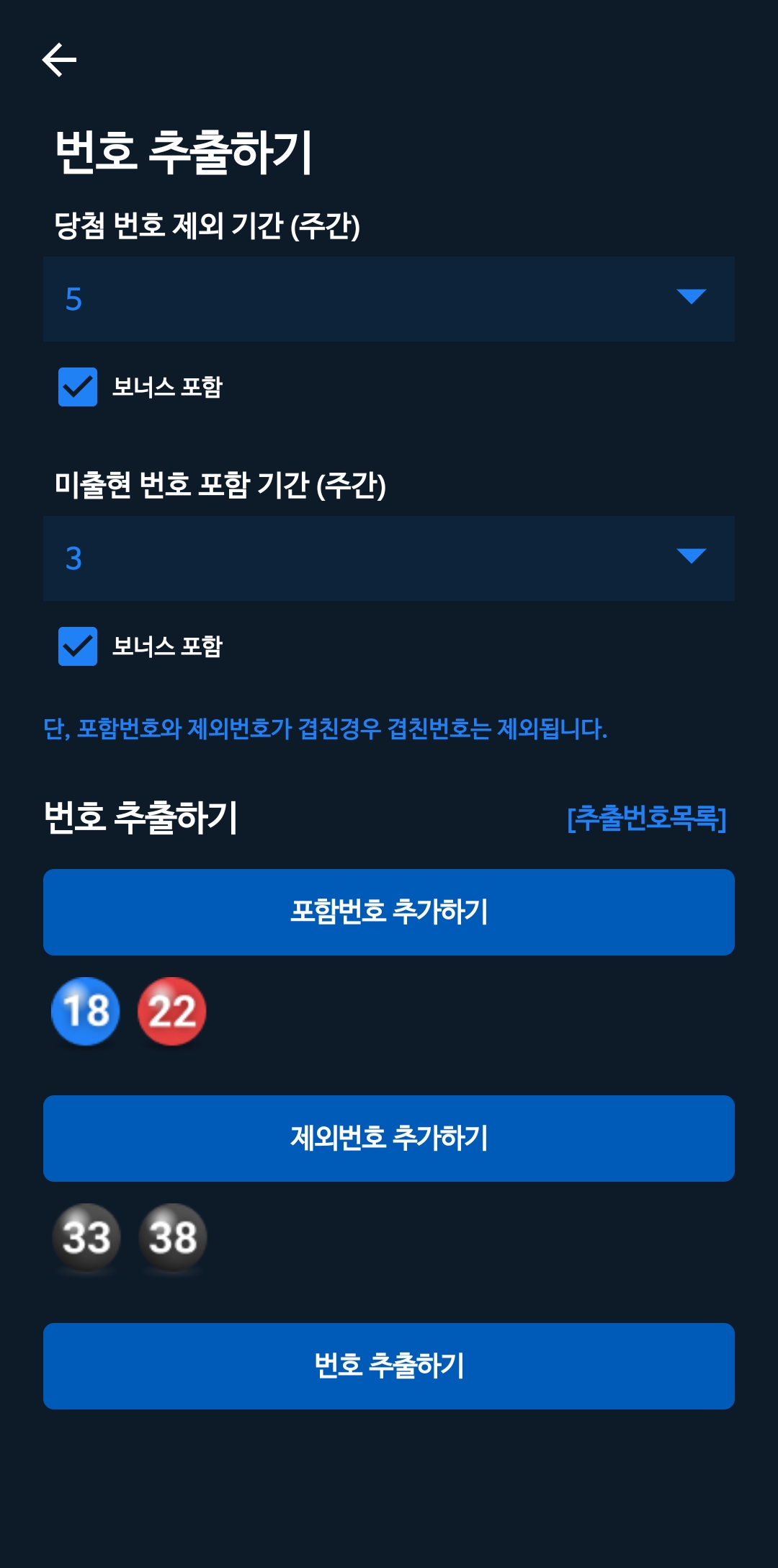 내가 원하는 번호 및 제외하고 싶은 번호를 선택할 수 있고