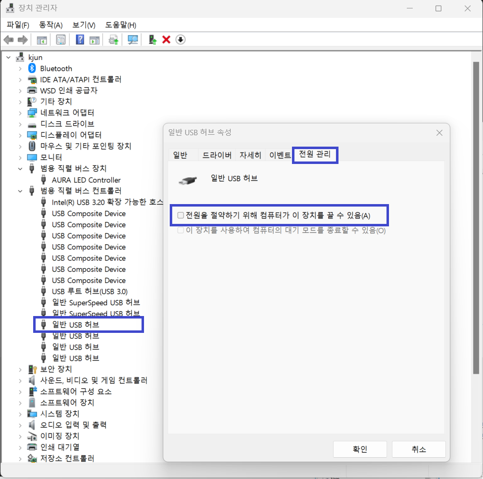 전원 관리 탭에서 전원을 절약하기 위해 컴퓨터가 이 장치를 끌 수 있음 체크박스를 해제합니다.