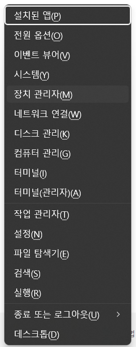 Windows + x 키를 눌러 나온 메뉴에서 장치관리자 를 선택하고