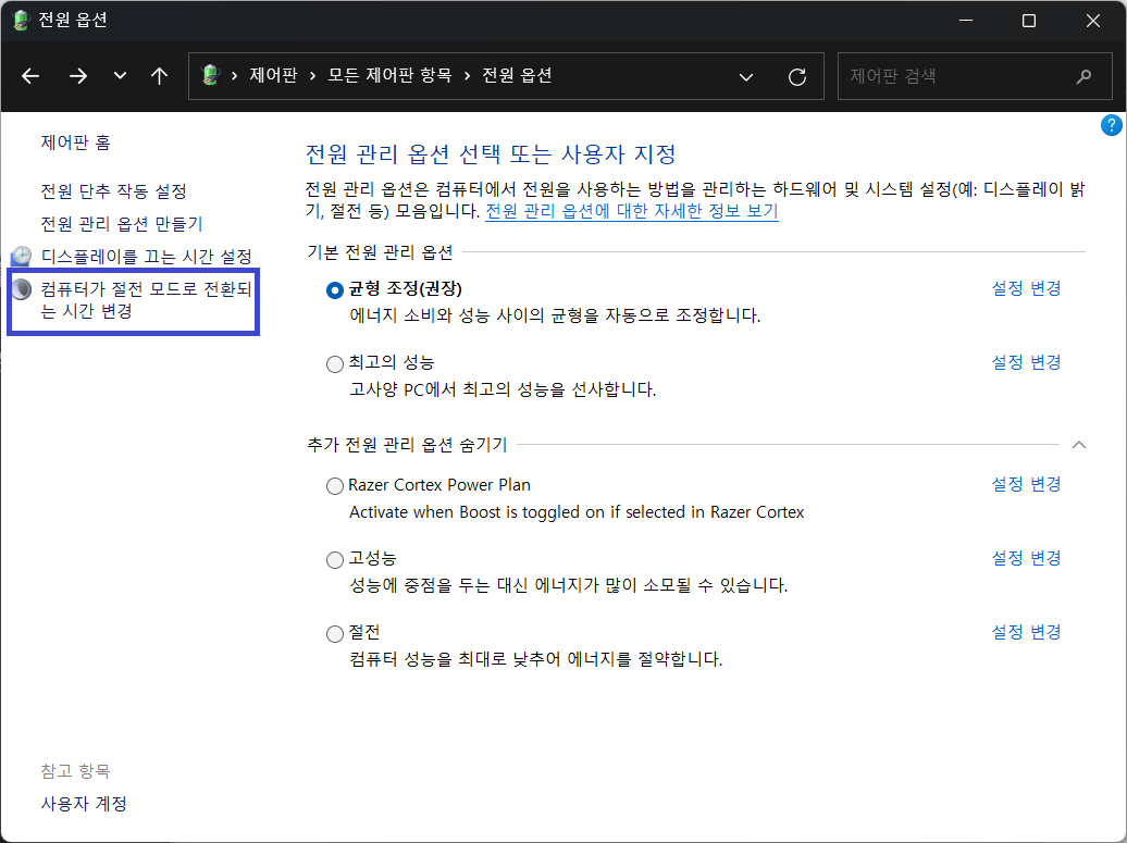 제어판 > 전원 옵션 > 컴퓨터가 절전 모드로 전환되는 시간 변경 > 고급 전원 관리 옵션 설정 변경 을 선택합니다.