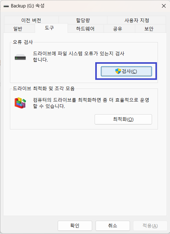 도구탭에서 오류검사의 검사 버튼을 클릭해 실행합니다.