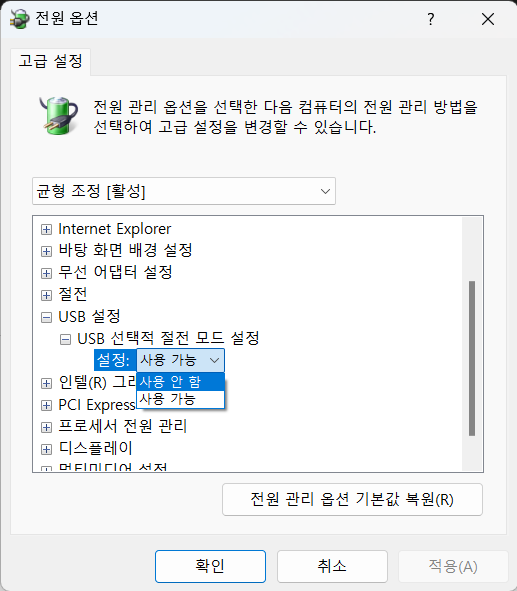 아래의 전원 옵션 창에서 USB 설정의 USB 선택적 절전 모드 설정 부분을 사용 안 함 으로 바꾸고 확인 합니다.